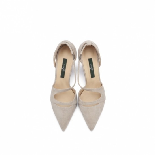 • 차분한 베이지 스웨이드 소재의 사선 스트랩 하이힐 슬링백