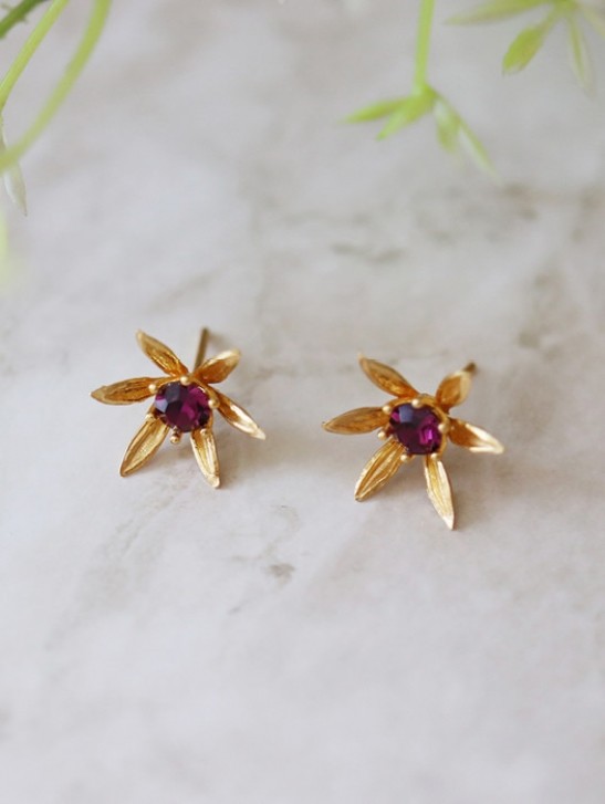 • 황동 소재에 진한 24k 골드가 도금 된 꽃받침에 버건디 컬러의 스와로브스키 크리스탈이 세팅되어 있는 꽃 귀걸이