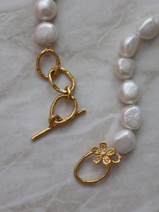 • 굵은 11mm 진주들이 꿰어지고 꽃으로 마무리 장식이 된 화려한 무드의 진주 목걸이