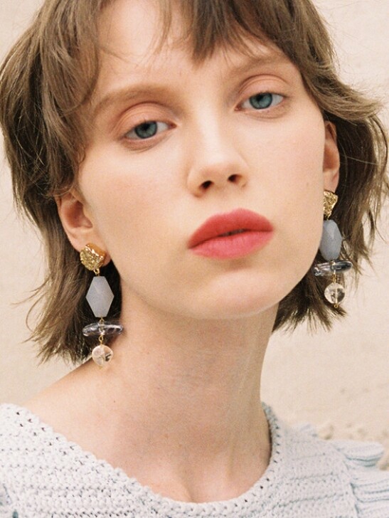 • 바다에 파도를 맞아 파인 돌의 목습을 담은 골드 펜던트와 구조적인 형태의 비즈들로 엮여진 드롭 이어링
