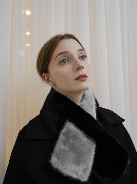 • 한면은 블루블랙, 다른면은 그레이로된 풀스루 여밈 타입의 100% 밍크 스카프