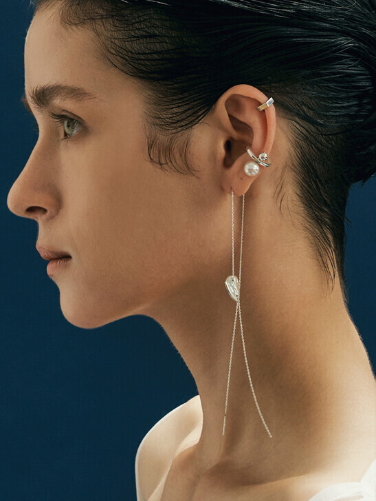 • 아래로 길게 떨어지는 롱한 길이감의 드롭 된 실버 체인 귀걸이