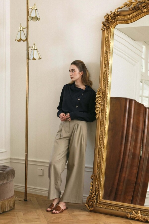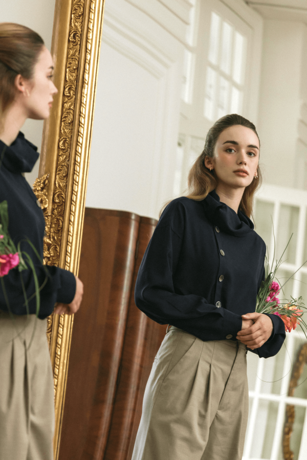 • 빛에 따라 여러 색깔을 나타내는 천연 자개 단추를 포인트로 한 투웨이 블라우스입니다. 단추를 끝까지 채워 하이넥으로 연출 할 수 있고, 카라를 늘어뜨리는 형식으로도 연출 가능합니다. 일본 프리미엄 원단사인 STYLEM사의 CUPRO 100%로 구성된 지속가능한 원단을 사용하였습니다. 고급스러운 광택감과 드레이프성이 뛰어난 원단으로, 우아한 실루엣을 담았습니다.
