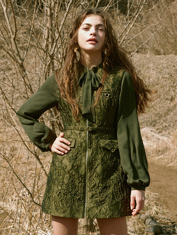 • 스카프 타입의 타이와 진주장식 단추로 완성시키는 페미닌한 분위기의 블라우스