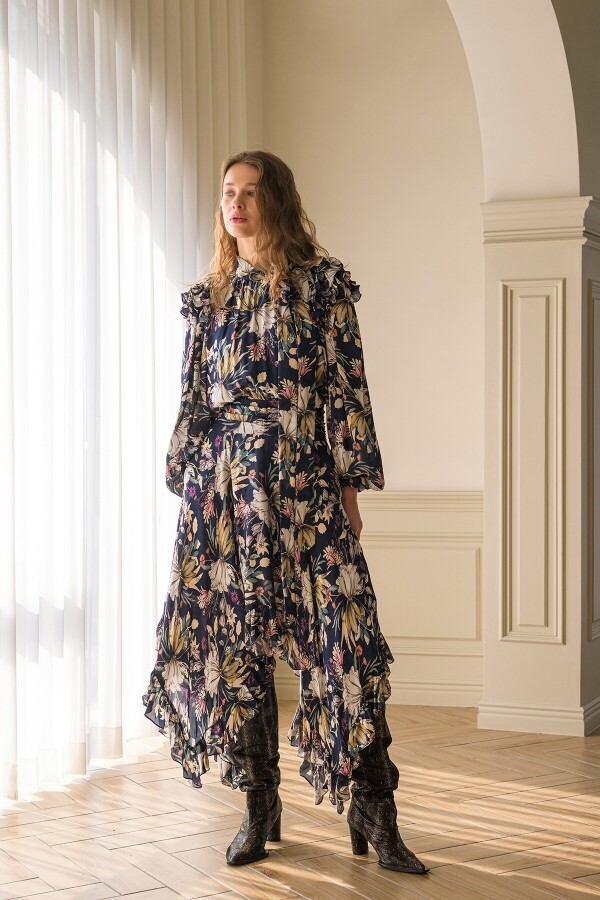 미드나잇 블루 컬러의 언밸런스 원피스 숄더 부분의 4단 프릴로 풍성한 볼륨감을 준 디자인 잔잔한 셔링으로 허리를 잡아주어 날씬한 바디라인 연출 커프스 밴딩 처리로 소매 볼륨감과 함께 편한 착장감을 더해준 디자인 언밸런스한 기장으로 걸을 때마다 화려한 무브먼트 선사 하늘하늘한 소재로 가볍고 편한 착장감 소매 밑단 밴딩 처리로 편한 착용감과 함께 잔잔한 개더를 넣어 볼륨감을 더해준 디자인