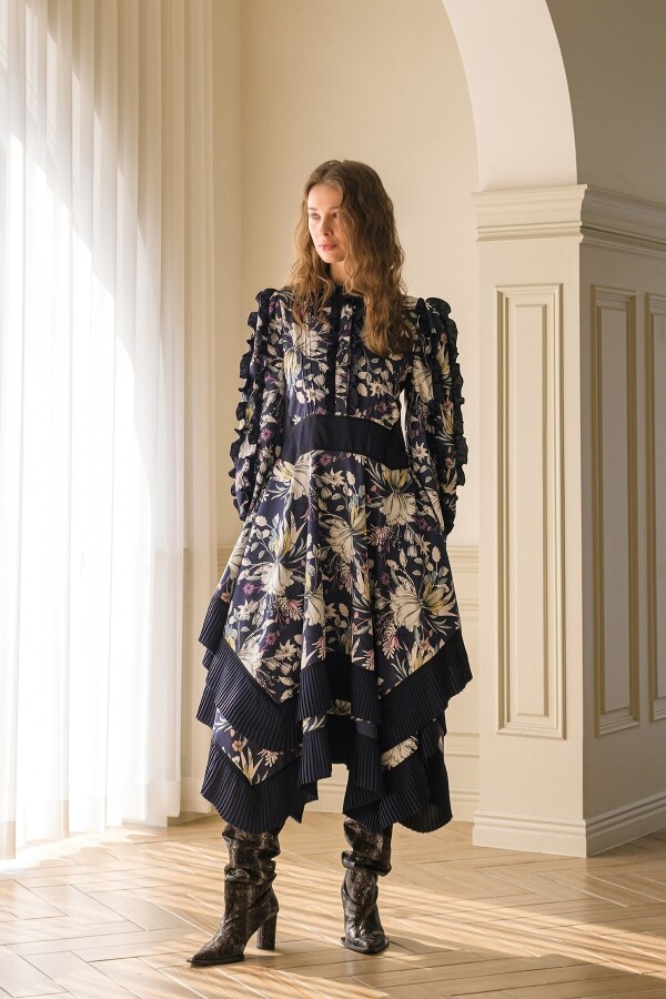 미드나잇 블루 컬러의 언밸런스 원피스 숄더 부분의 4단 프릴로 풍성한 볼륨감을 준 디자인 잔잔한 셔링으로 허리를 잡아주어 날씬한 바디라인 연출 커프스 밴딩 처리로 소매 볼륨감과 함께 편한 착장감을 더해준 디자인 언밸런스한 기장으로 걸을 때마다 화려한 무브먼트 선사 하늘하늘한 소재로 가볍고 편한 착장감 소매 밑단 밴딩 처리로 편한 착용감과 함께 잔잔한 개더를 넣어 볼륨감을 더해준 디자인