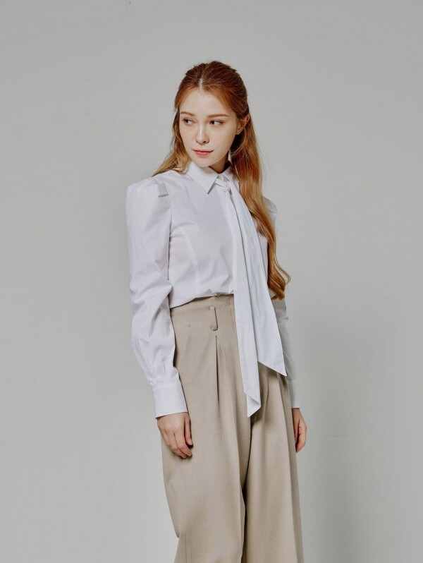 • 모던 시크한 매력의 코튼 슬림핏 타이 퍼프블라우스
