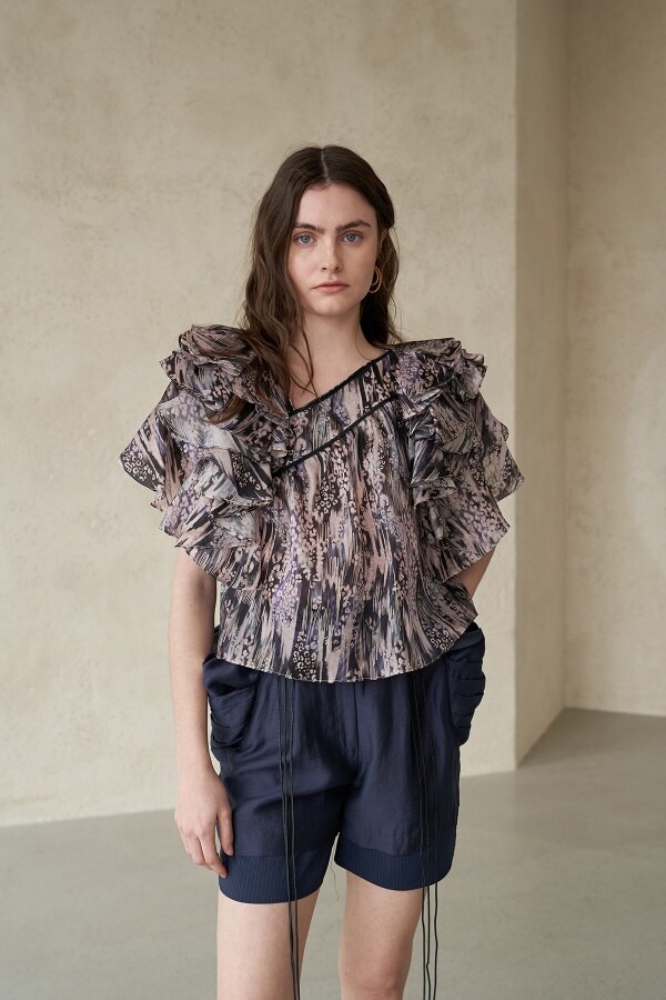 크림 컬러의 러플 블라우스 잔잔한 프릴과 넓은 러플 디테일의 페미닌한 무드의 블라우스 봄, 초여름, 가을, 초겨울까지 착용 가능한 실용성 높은 소재 소매 밑단 밴딩 처리로 편한 착용감과 함께 잔잔한 개더를 넣어 볼륨감을 더해준 디자인