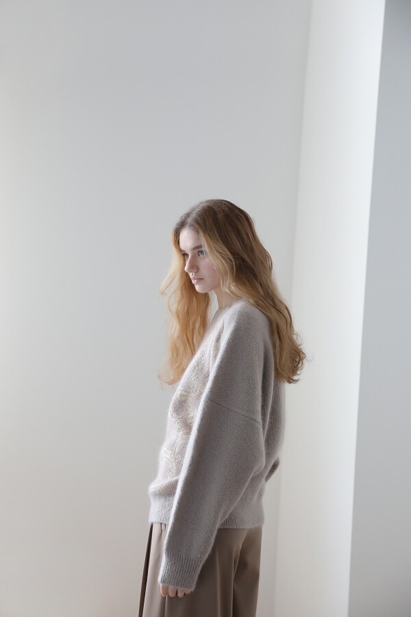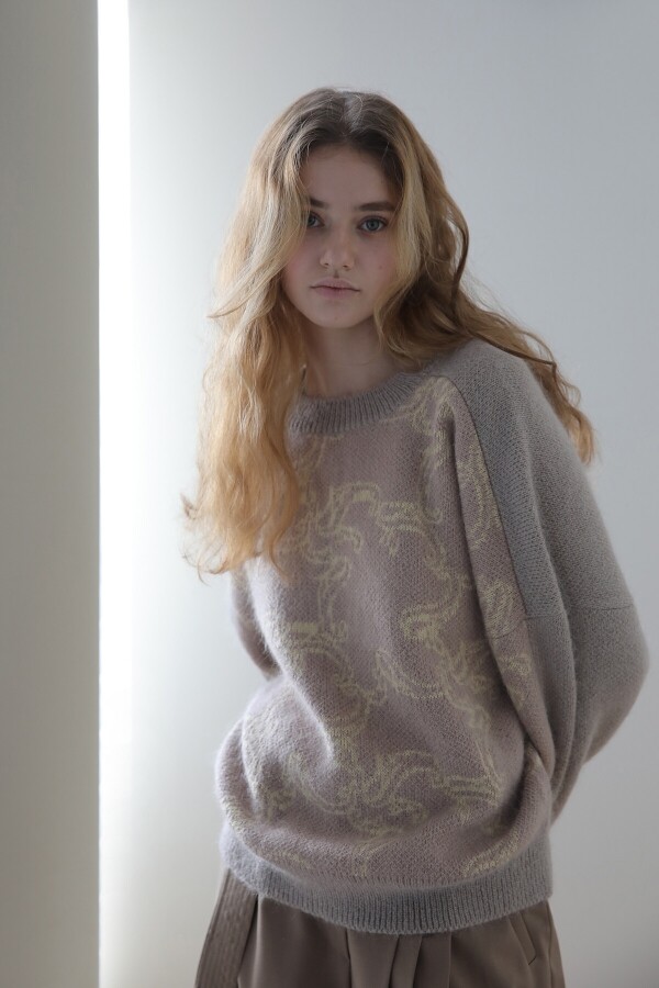 블랙&퍼플 컬러의 자카드 니트 넥라인 양쪽 사이드 슬릿 포인트 루즈핏의 드롭 어깨 라인 프론트 투톤 자카드 패턴 부드럽고 포근한 모헤어 소재