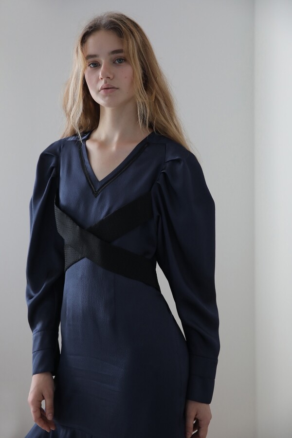 네이비 블루 컬러의 V넥 언밸런스 원피스 블랙 컬러의 크로스 디테일 포인트 광택감이 있는 부드러운 새틴 소재