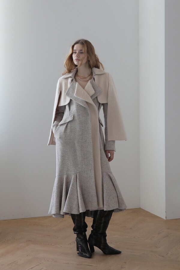 • 트위드 소재의 케이프 코트 어깨 위에 숄을 걸친 듯한 케이프 디자인 탄탄한 조직감의 트위드 소재 바디 실루엣을 살려주는 머메이드 아웃핏