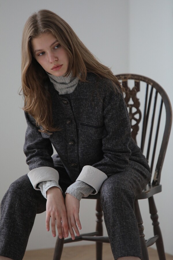 • 미드나잇 블루 컬러의 케이프 자켓 칼라와 케이프에 모헤어 소재의 체크 배색으로 포인트를 준 디자인 가볍고 보온성있는 울과 캐시미어 혼방 소재 자켓 단독으로 포인트를 주기 좋아 소장 가치가 높은 아이템