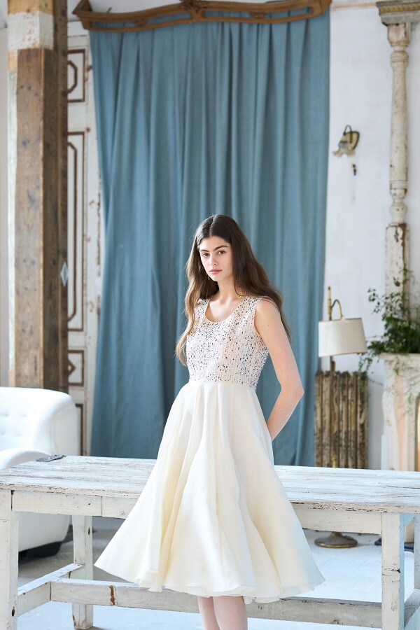 아이보리 컬러의 비즈 원피스 언밸런스 컷아웃 포인트 비즈 원단을 겹쳐 제작한 심플한 핏의 화려한 원피스 미디 기장의 H라인 원피스