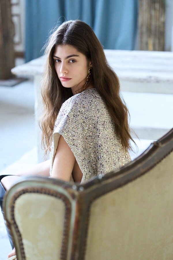• 아이보리 컬러의 비즈 원피스 언밸런스 컷아웃 포인트 비즈 원단을 겹쳐 제작한 심플한 핏의 화려한 원피스 미디 기장의 H라인 원피스