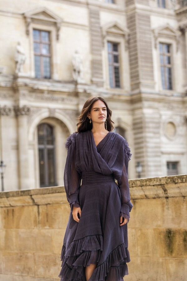 퍼플 컬러의 오프숄더 원피스 암홀 아래 컷아웃 된 부분에 팔을 넣어 착용하는 케이프 디자인 루즈한 실루엣의 로우웨스트 언밸런스한 3단 티어드 디자인 페이즐리 프린트의 금사 스트라이프 실크 소재