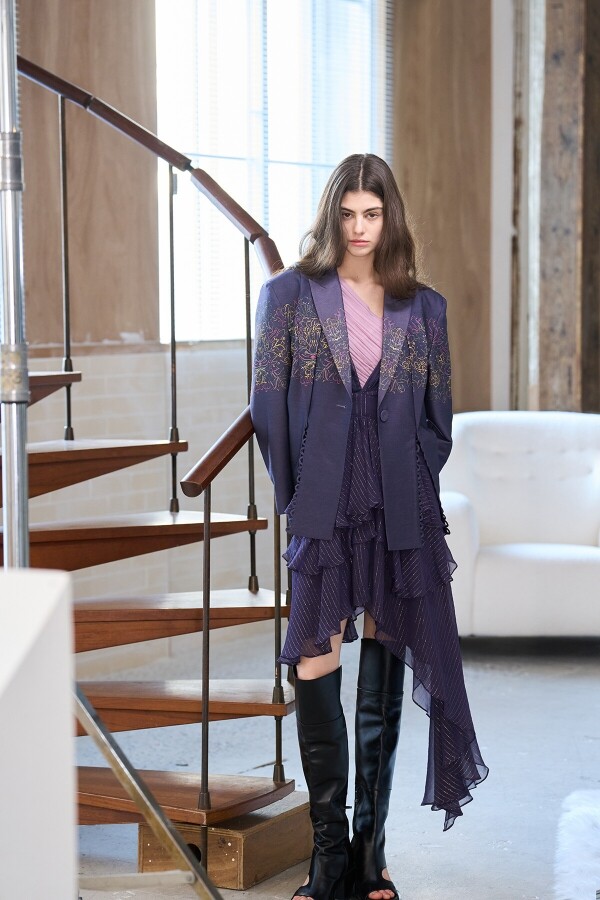 • 퍼플 컬러의 울실크 자켓 페이즐리 프린트 포인트 유니크한 더블 테일러드 칼라 블랙 리본으로 레이스업 포인트