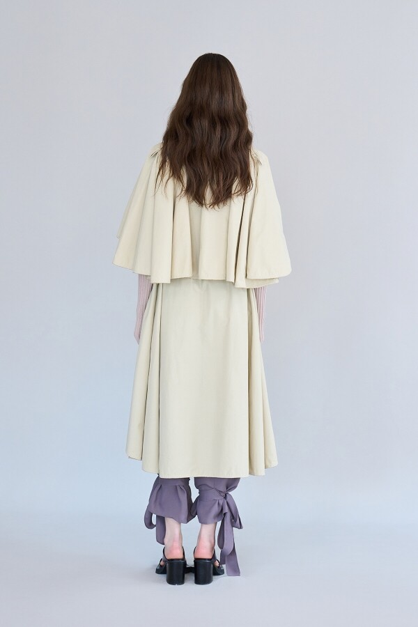 소이빈 컬러의 트렌치코트 언밸런스한 케이프 스타일 A라인 실루엣의 트렌치코트