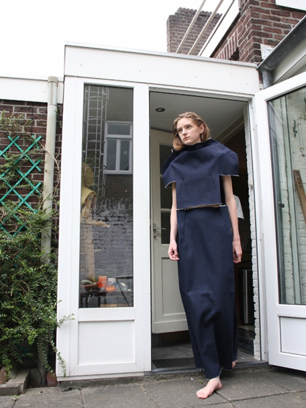 사각형의 면을 접기 방식만으로 디자인한 데님 소재 스커트