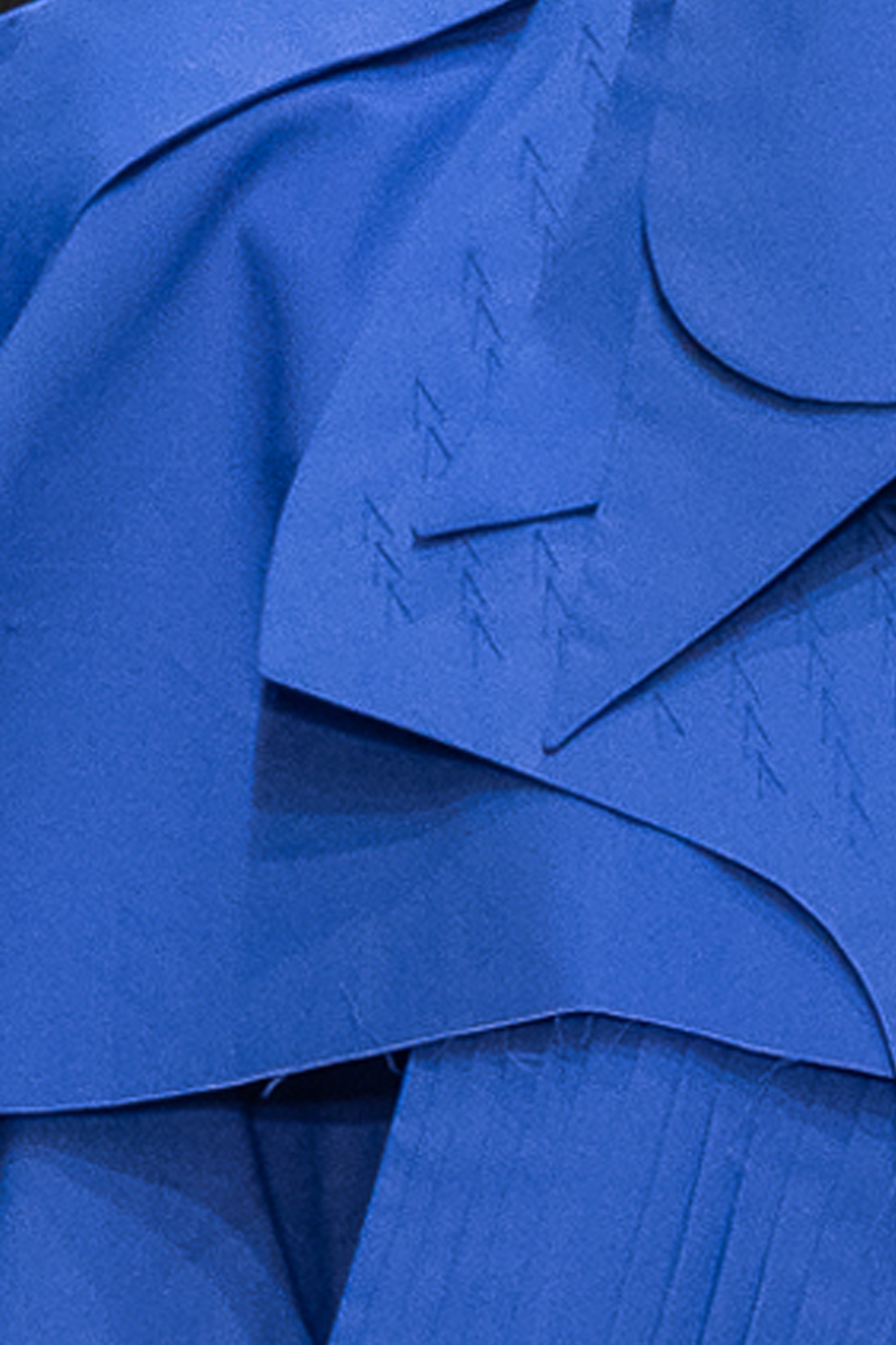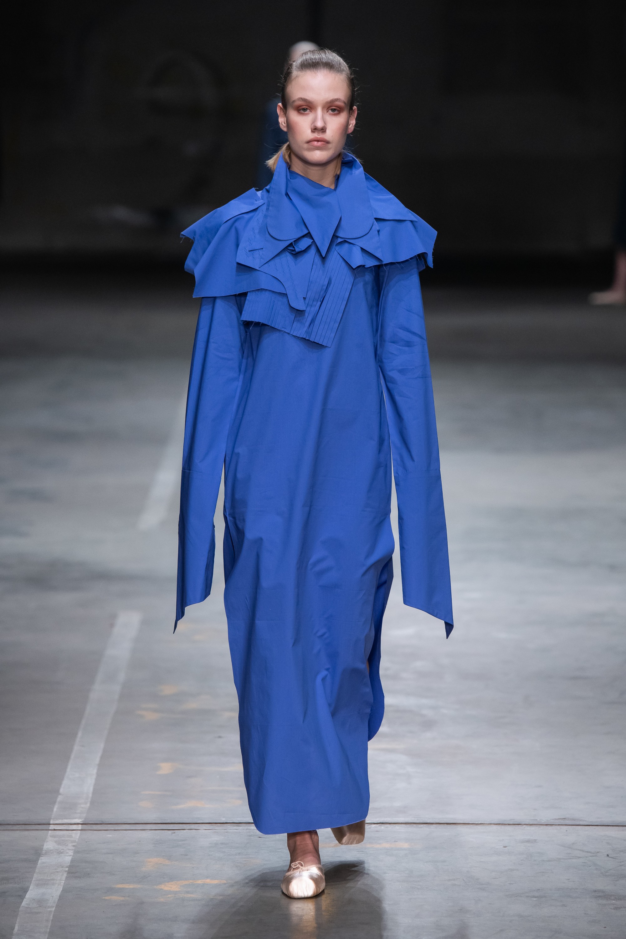 His designs exhibit visualized concepts, artisanal textiles, and structural silhouettes.