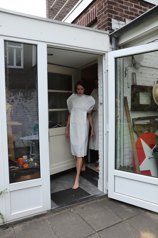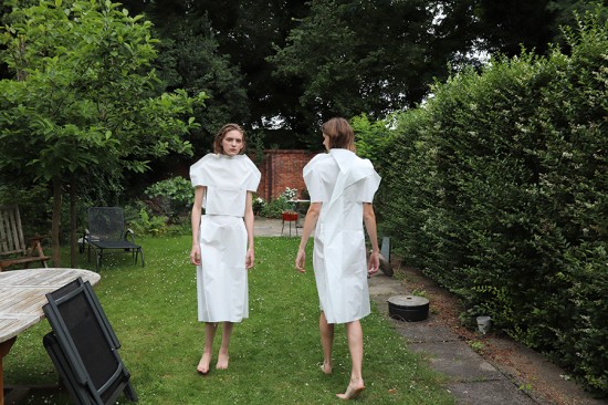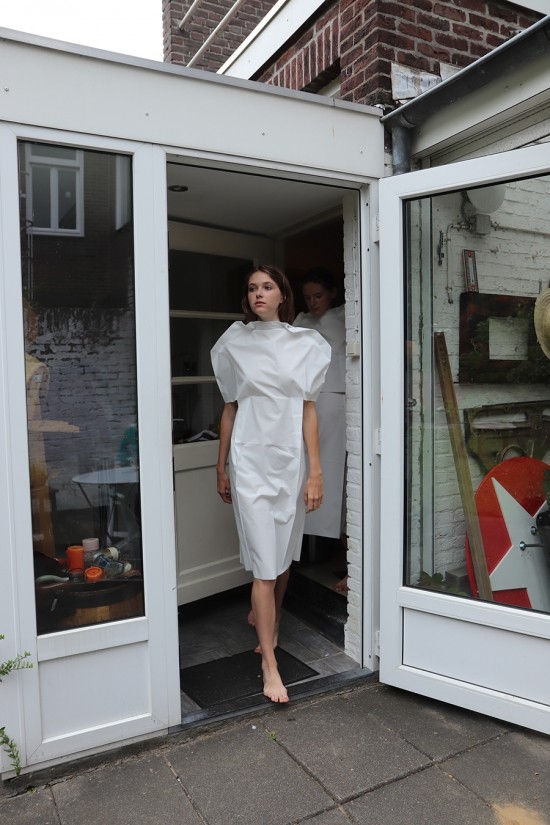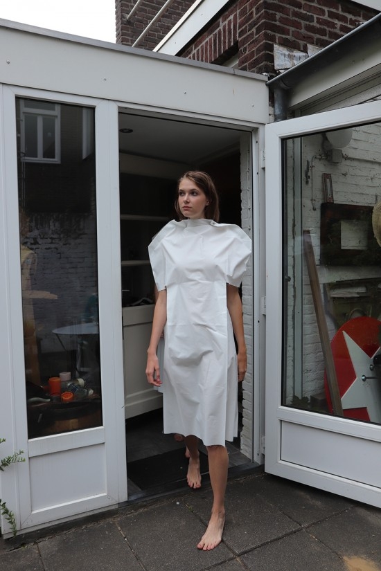 사각형의 면을 접기 방식만으로 디자인한 제품으로 커팅 라인이 없는 소매와 바디라인이 특징인 디자인입니다.